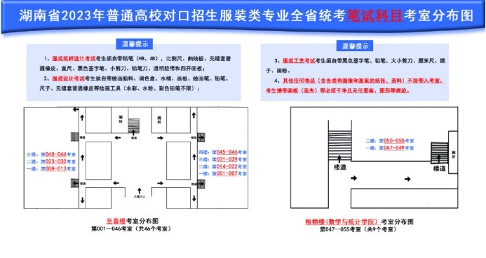 服裝類專業(yè)考試,服裝紙樣設(shè)計(jì)和服裝設(shè)計(jì)考室設(shè)湖南師范大學(xué)至善樓和格物樓,服裝工藝考試考室設(shè)湖南師范大學(xué)工程與設(shè)計(jì)學(xué)院服裝樓。