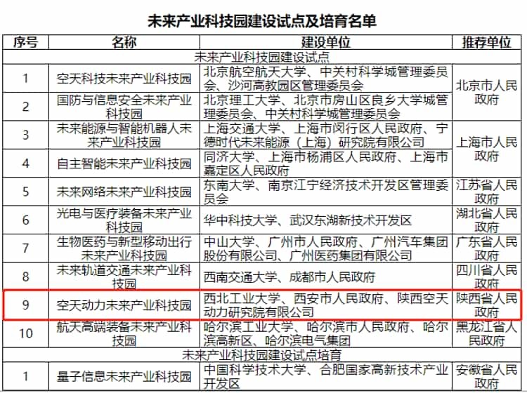 2022年11月28日,科技部、教育部發(fā)布《關(guān)于批復(fù)未來產(chǎn)業(yè)科技園建設(shè)試點的函》,由西北工業(yè)大學(xué)作為牽頭單位,聯(lián)合西安市人民政府和陜西空天動力研究院有限公司共建的空天動力未來產(chǎn)業(yè)科技園成功入選首批未來產(chǎn)業(yè)科技園建設(shè)試點,