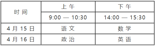 文化考試科目為語文、數(shù)學(xué)、政治、英語四科,每科滿分150分,四科滿分600分,使用國家通用語言文字作答。文化考試按全國統(tǒng)一時間,由省教育考試院組織,考試時間: