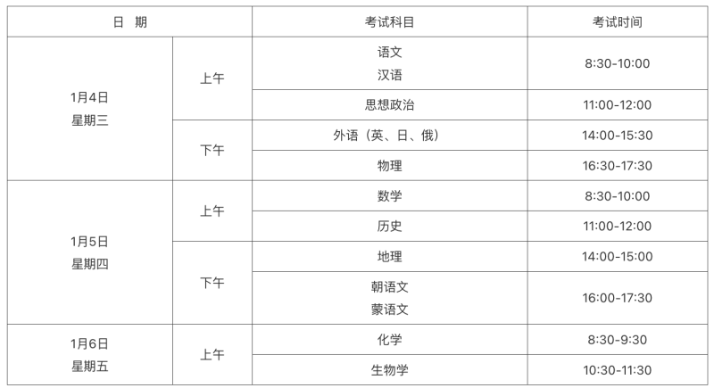 經(jīng)省教育廳研究決定,2023年1月遼寧省普通高中學業(yè)水平合格性考試時間調整為2023年1月4日至6日。具體時間如下:
