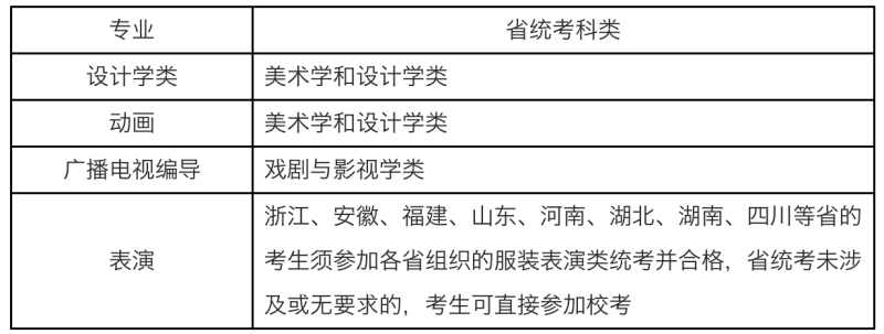根據(jù)我校藝術(shù)類(lèi)專(zhuān)業(yè)錄取原則,各省有統(tǒng)考要求的專(zhuān)業(yè),考生須參加所在?。ㄗ灾螀^(qū)、直轄市)組織的相應(yīng)科類(lèi)統(tǒng)考并合格,省統(tǒng)考科類(lèi)和統(tǒng)考子科類(lèi)以各省公布的為準(zhǔn)。我校各專(zhuān)業(yè)對(duì)應(yīng)的省統(tǒng)考科類(lèi)如下。