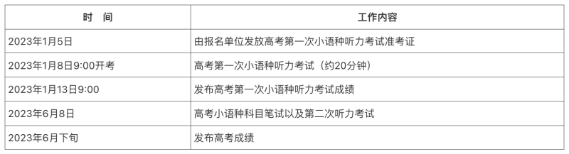 北京市2023年普通高等學(xué)校招生外語(非英語)(以下簡稱“小語種”)聽力考試實(shí)行一年兩考。第一次考試于2023年1月8日進(jìn)行,第二次考試于2023年6月8日進(jìn)行。具體日程安排如下。