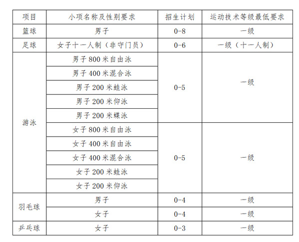 5.計(jì)劃調(diào)整辦法:若某一項(xiàng)目第一志愿最低錄取控制線上生源不足時(shí),則將該項(xiàng)目剩余計(jì)劃調(diào)整到其他項(xiàng)目,按照籃球(男子)→乒乓球(女子)→游泳(男子)→游泳(女子)→足球(女子,十一人制,非守門(mén)員)→羽毛球(男子)→羽毛球(女子)的項(xiàng)目順序依次增加,每輪每個(gè)項(xiàng)目增加1個(gè)計(jì)劃,直到完成招生計(jì)劃。如調(diào)整后第一志愿仍未完成招生計(jì)劃,剩余計(jì)劃錄取第二志愿考生。若第二志愿某一項(xiàng)目最低錄取控制線上生源不足時(shí),計(jì)劃調(diào)整辦法同第一志愿。