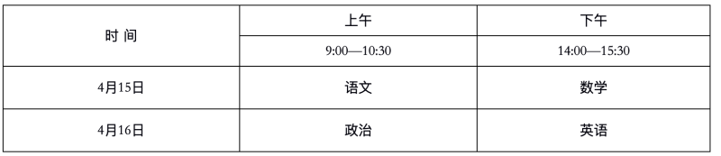 考生必須參加高考報(bào)名所在地省級(jí)招生考試機(jī)構(gòu)組織的文化考試??荚嚳颇繛檎Z(yǔ)文、數(shù)學(xué)、政治、英語(yǔ)四科,每科滿(mǎn)分150分,總分600分,使用國(guó)家通用語(yǔ)言文字作答。文化考試時(shí)間安排如下:
