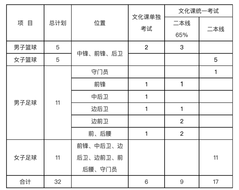 5.男、女籃球只招非國家體育總局籃球運動管理中心注冊隊員,男、女足球只招非中國足球協(xié)會注冊隊員。