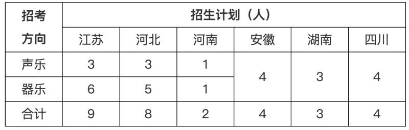 音樂(lè)學(xué)辦學(xué)層次為本科,學(xué)制4年,2023年招生計(jì)劃30人,含聲樂(lè)和器樂(lè),分省招生計(jì)劃如下。