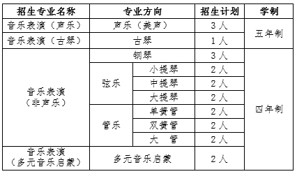 1.音樂表演專業(yè)招生不做分省計(jì)劃。專業(yè)測(cè)試結(jié)束后,學(xué)??筛鶕?jù)實(shí)際生源情況調(diào)整各專業(yè)方向招生計(jì)劃并認(rèn)定合格生,寧缺毋濫。