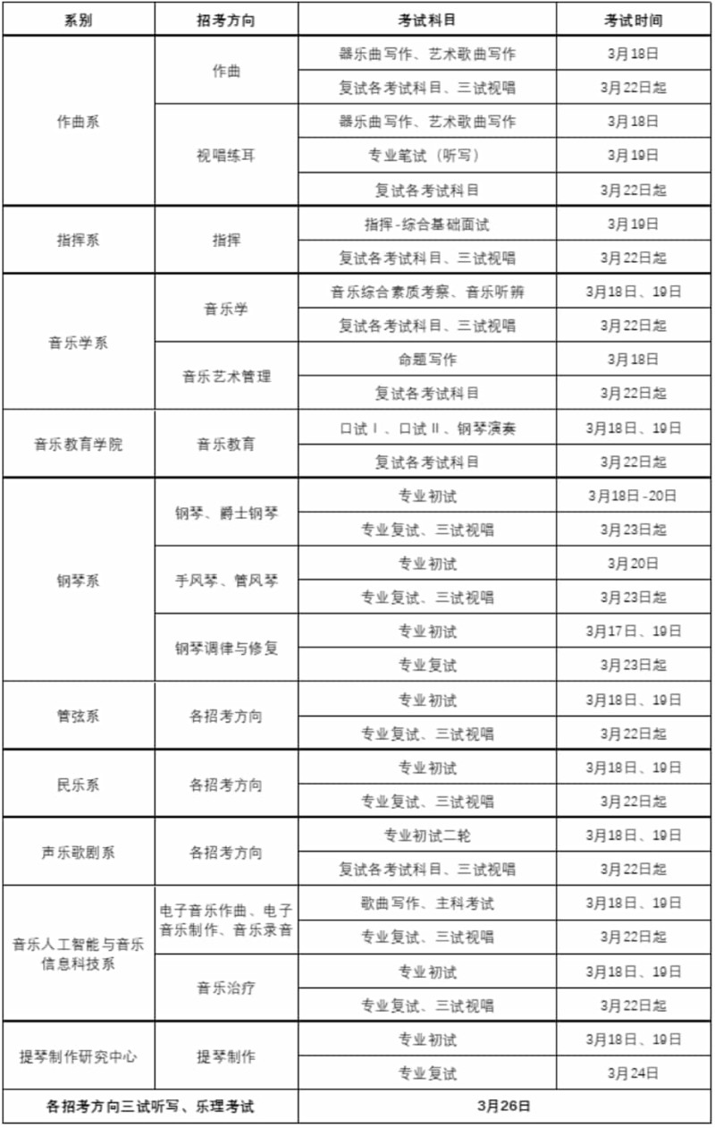 中央音樂學院2023年本科招生于3月17日起正式開考,現(xiàn)將各系考試安排公布如下。正式考試的具體時間、考場安排等另行通知,請考生密切關(guān)注我校本科招生網(wǎng)站(zhaoban.ccom.edu.cn)相關(guān)信息。