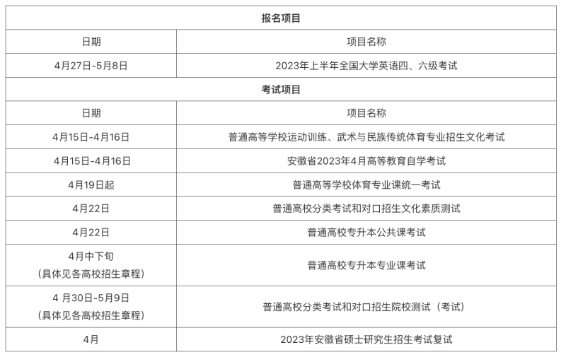 安徽省2023年4月教育招生考試月歷公布,具體如下: