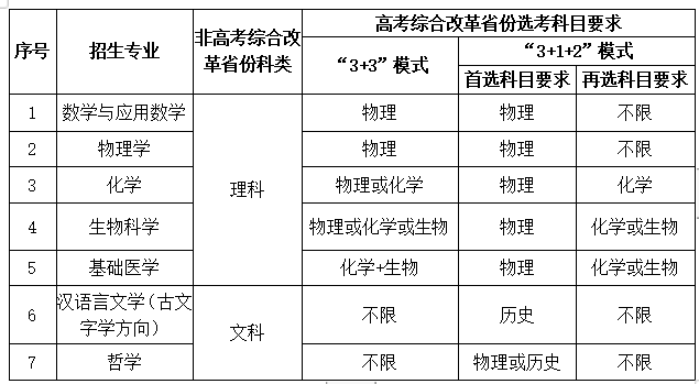 為突出基礎(chǔ)學(xué)科在國(guó)家關(guān)鍵領(lǐng)域的支撐引領(lǐng)作用,同時(shí)聚焦國(guó)家人才緊缺的人文社會(huì)科學(xué)領(lǐng)域,我校強(qiáng)基計(jì)劃招生專業(yè)設(shè)置如下:數(shù)學(xué)與應(yīng)用數(shù)學(xué)、物理學(xué)、化學(xué)、生物科學(xué)、基礎(chǔ)醫(yī)學(xué)﹑漢語(yǔ)言文學(xué)(古文字學(xué)方向)﹑哲學(xué)。