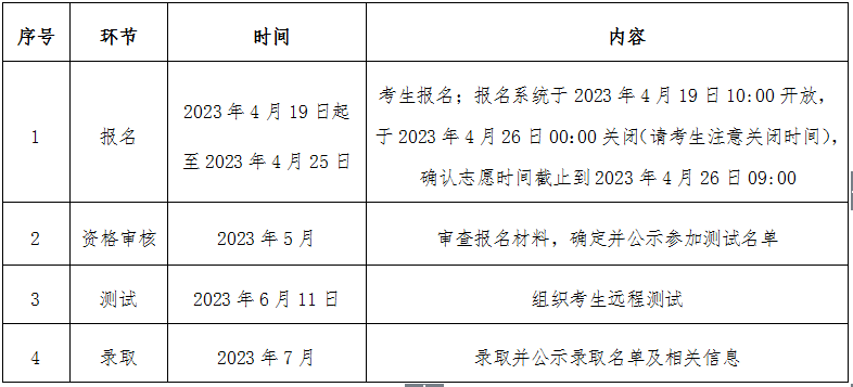 報(bào)名時(shí)間為2023年4月19日 - 2023年4月25日。報(bào)名系統(tǒng)于2023年4月19日10:00開(kāi)放,于2023年4月26日00:00關(guān)閉(請(qǐng)考生注意關(guān)閉時(shí)間),確認(rèn)志愿時(shí)間截止到2023年4月26日09:00,未確認(rèn)志愿的考生報(bào)名無(wú)效。