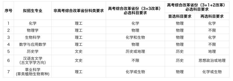 我校2023年強(qiáng)基計劃具體招生專業(yè)及相關(guān)要求見下表,具體分省招生計劃詳見蘭州大學(xué)強(qiáng)基計劃報名系統(tǒng)??忌祁悾ǜ呖季C合改革省份的選考科目)須與我校相關(guān)專業(yè)要求相匹配。