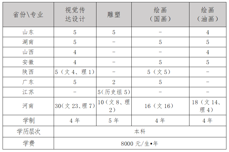 河南、山東、湖南、山西、安徽、陜西、廣東、江蘇八省使用省統(tǒng)考成績錄取。具體招生專業(yè)信息及人數(shù)如下: