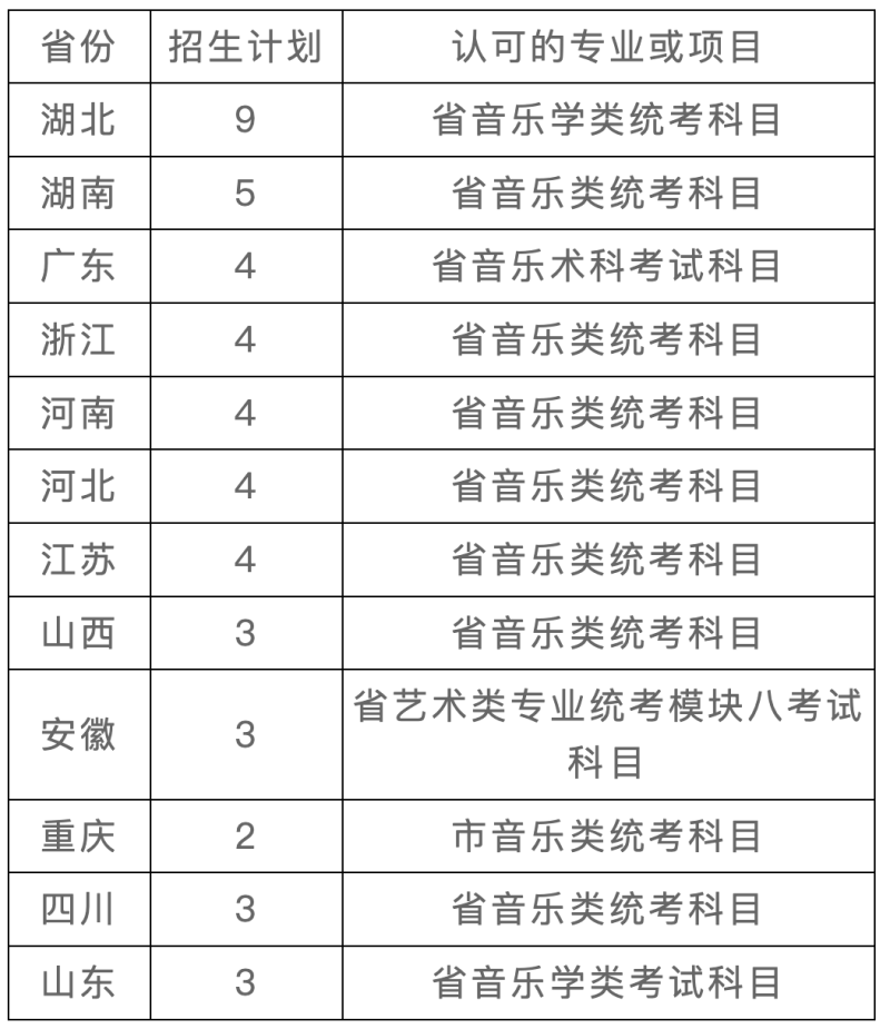 2.參加所在省級招生考試部門組織的音樂類專業(yè)統(tǒng)一考試并達到該省劃定的合格線,取得音樂類專業(yè)省統(tǒng)考合格證且專業(yè)測試科目的主項必須為聲樂、器樂、鋼琴中的一項。具體如下: