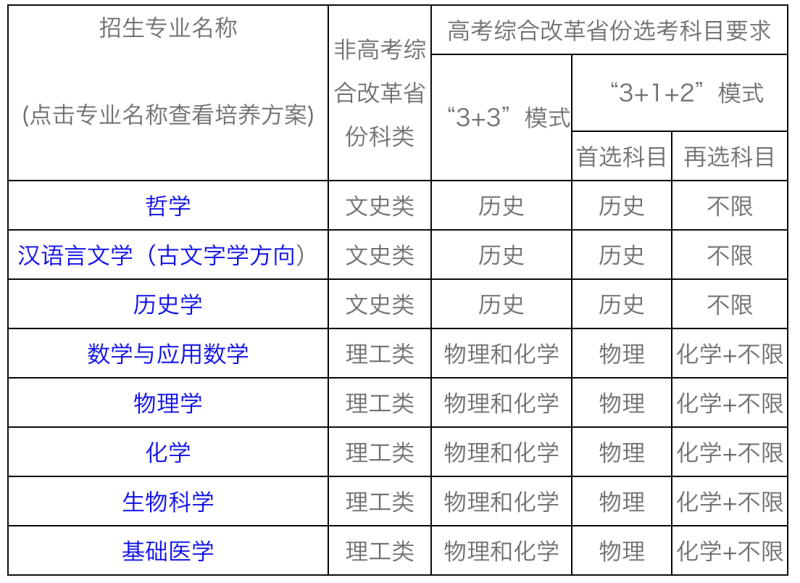 結(jié)合學(xué)校相關(guān)專業(yè)優(yōu)勢(shì)與辦學(xué)特色,我校強(qiáng)基計(jì)劃招生專業(yè)為哲學(xué)、漢語言文學(xué)(古文字學(xué)方向)、歷史學(xué)、數(shù)學(xué)與應(yīng)用數(shù)學(xué)、物理學(xué)、化學(xué)、生物科學(xué)、基礎(chǔ)醫(yī)學(xué)。各專業(yè)招生科類及選考科目要求如下: