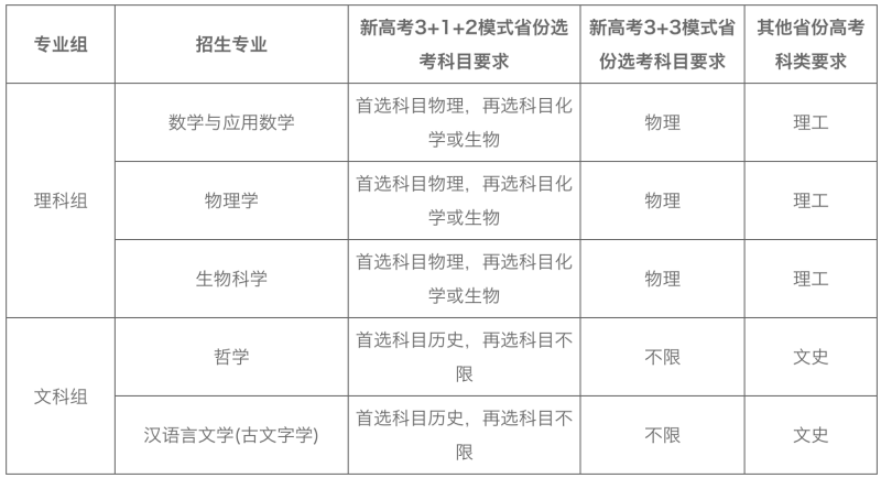 服務(wù)國家重大戰(zhàn)略需求的基礎(chǔ)理科學(xué)科以及國家人才緊缺的社會科學(xué)與人文學(xué)科領(lǐng)域,招生專業(yè)、選考科目、科類要求及招生計劃見下表:
