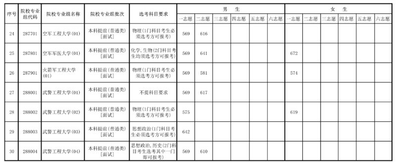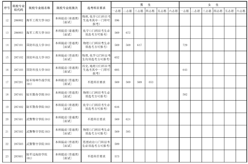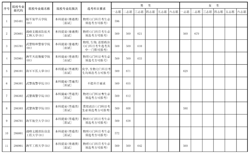 根據(jù)中央軍委訓(xùn)練管理部院校局要求,考生面試體檢比例從報考軍隊(duì)院校且政治考核通過、達(dá)到我區(qū)第一批本科最低錄取控制分?jǐn)?shù)線的考生中,區(qū)分性別、科類,依據(jù)高考總分從高到低的順序,按照招生計(jì)劃數(shù)量的了至5倍確定參加面試和體格檢查的考生對象。其中,文科、女生和體檢標(biāo)準(zhǔn)要求為機(jī)降、特種作戰(zhàn)專業(yè)合格的專業(yè),叁檢人