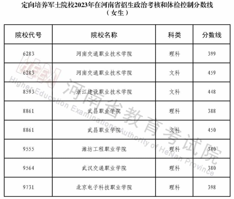 根據(jù)河南省教育廳、省公安廳和省軍區(qū)動員局《關(guān)于做好2023年招收定向培養(yǎng)軍士工作的通知》(豫軍動〔2023〕9號)文件要求,現(xiàn)將河南省2023年普通高校招生定向培養(yǎng)軍士政治考核和體格檢查控制分數(shù)線、時間、地點等相關(guān)要求予以公布,請達到院校(僅限第一志愿)控制分數(shù)線的考生,在規(guī)定時間攜帶相關(guān)資料到指定地點參加政治考核和體格檢查。