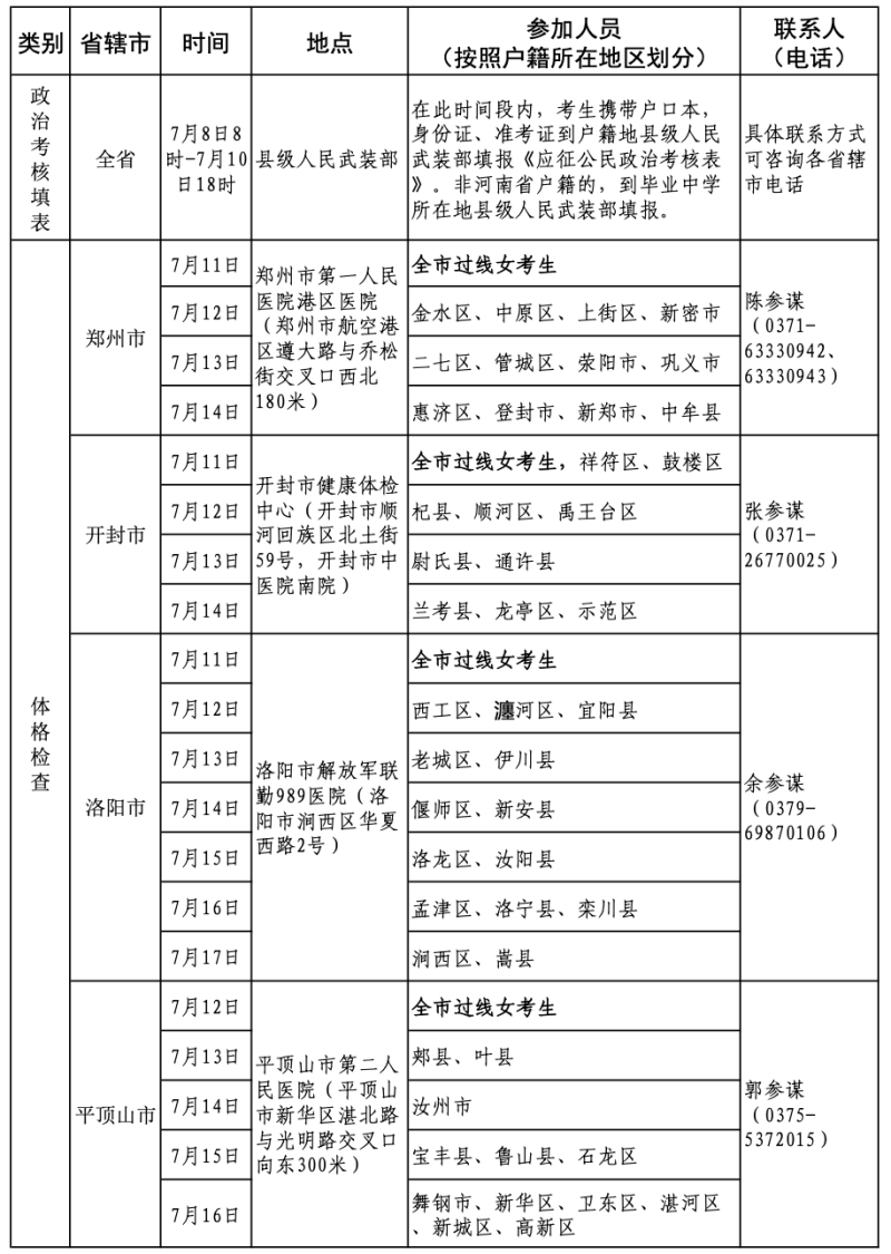 1.政治考核。政治考核由考生戶籍所在地縣(市、區(qū))征兵辦公室負責(zé);非河南省戶籍的,由畢業(yè)中學(xué)所在地縣(市、區(qū))征兵辦公室負責(zé)??忌栌?月8日8:00至7月10日18:00到政治考核所在地縣(市、區(qū))人民武裝部填報《應(yīng)征公民政治考核表》。