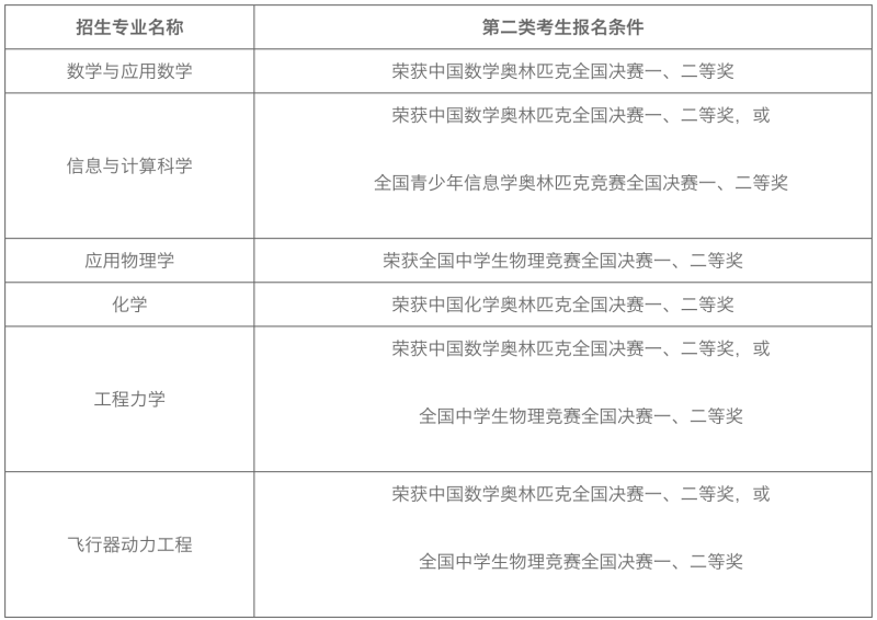 榮獲全國(guó)青少年學(xué)科奧林匹克競(jìng)賽(數(shù)學(xué)、物理、化學(xué)、信息學(xué))全國(guó)決賽一、二等獎(jiǎng)。全國(guó)青少年學(xué)科奧林匹克競(jìng)賽獲獎(jiǎng)學(xué)生以全國(guó)青少年科技競(jìng)賽獲獎(jiǎng)名單公示網(wǎng)站(http://gs.cyscc.org/)公示的名單為準(zhǔn)。各招生專業(yè)對(duì)應(yīng)的報(bào)名條件如下表所示。