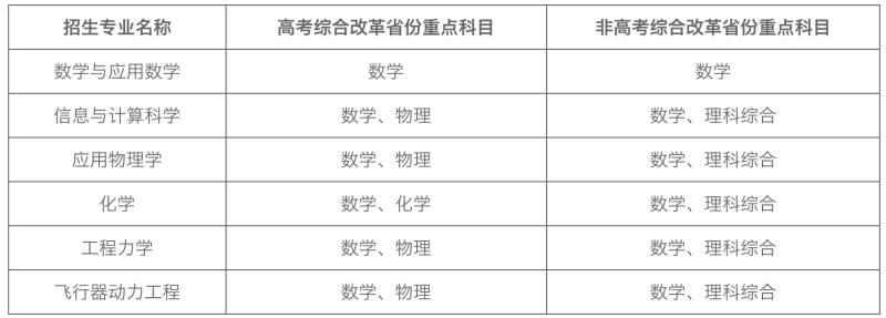 經(jīng)批準(zhǔn),我校自2020年起開(kāi)展基礎(chǔ)學(xué)科招生改革試點(diǎn)工作(也稱“強(qiáng)基計(jì)劃”),探索多維度考核評(píng)價(jià)模式,選拔一批有志向、有興趣、有天賦的青年學(xué)生,培養(yǎng)具有空天報(bào)國(guó)情懷、扎實(shí)數(shù)理基礎(chǔ)、科學(xué)創(chuàng)新能力、全球視野格局的高素質(zhì)拔尖創(chuàng)新人才,為國(guó)家重大戰(zhàn)略領(lǐng)域輸送后備人才。