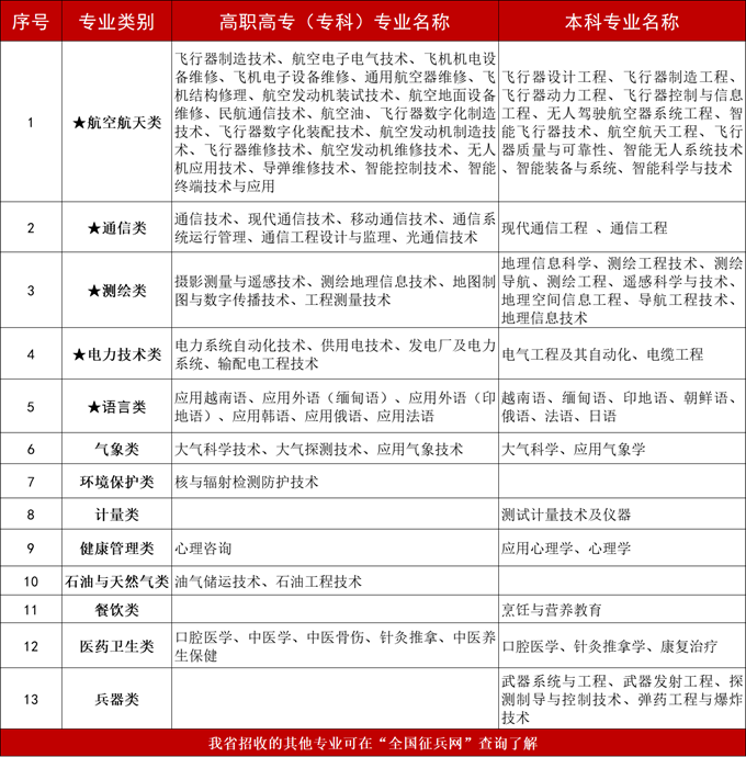 今年我省共計劃招收航空航天、語言(小語種)、電子信息、通信、環(huán)境保護、醫(yī)藥衛(wèi)生、健康管理、電力技術(shù)、測繪等41個軍民通用專業(yè),詳細專業(yè)可在“全國征兵網(wǎng)”-“招收軍士”-“招收專業(yè)查詢”處查詢了解。
