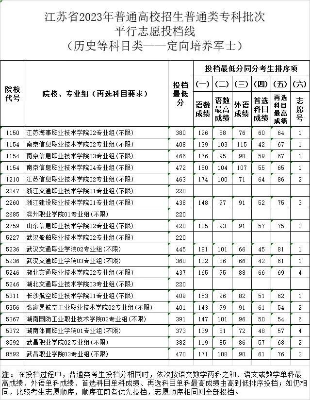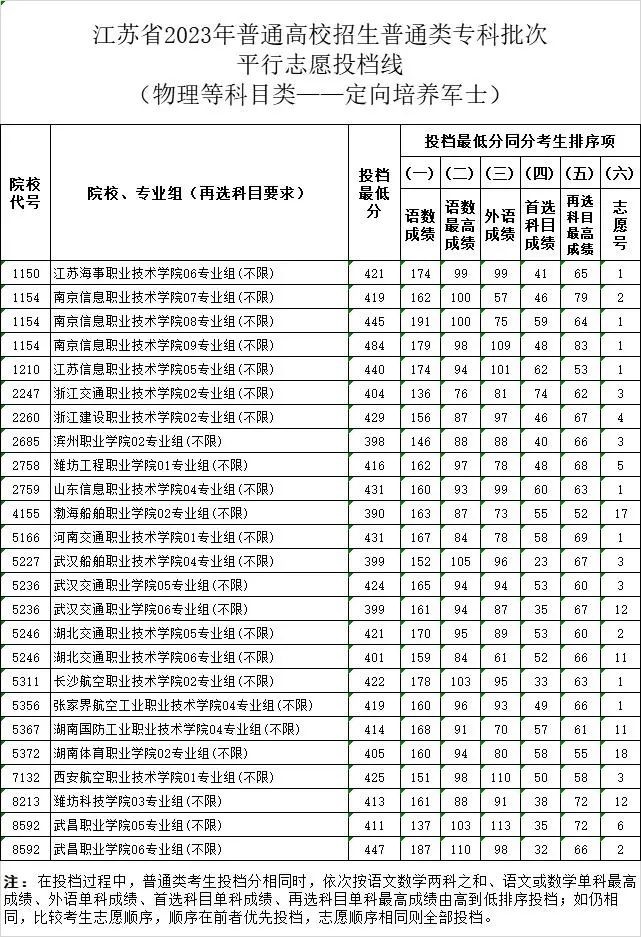 江蘇省2023年普通高校招生普通類??婆纹叫兄驹竿稒n線(定向培養(yǎng)軍士)公布,具體分?jǐn)?shù)如下: