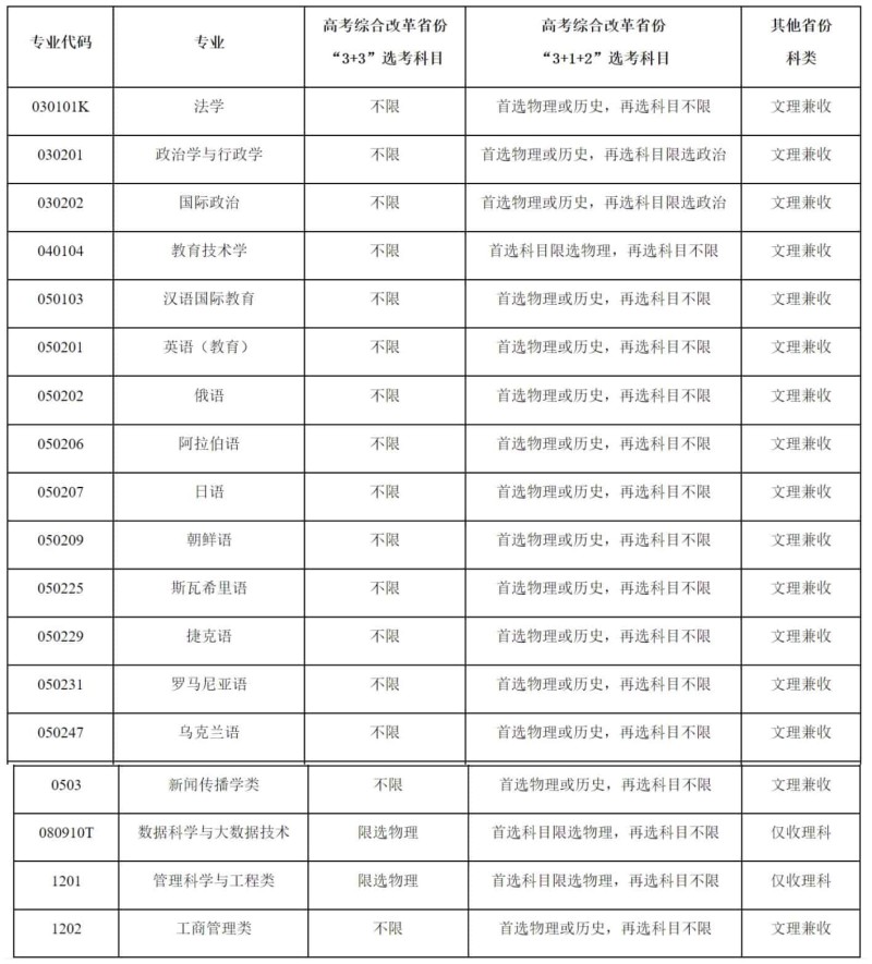 上海外國語大學(xué)2022年高校專項招生計劃數(shù)以教育部核定的高校專項計劃招生規(guī)模為準(zhǔn),學(xué)校將制定分省計劃(具體原則見下文第四條)。招生專業(yè)目錄及選考科目、科類要求如下: