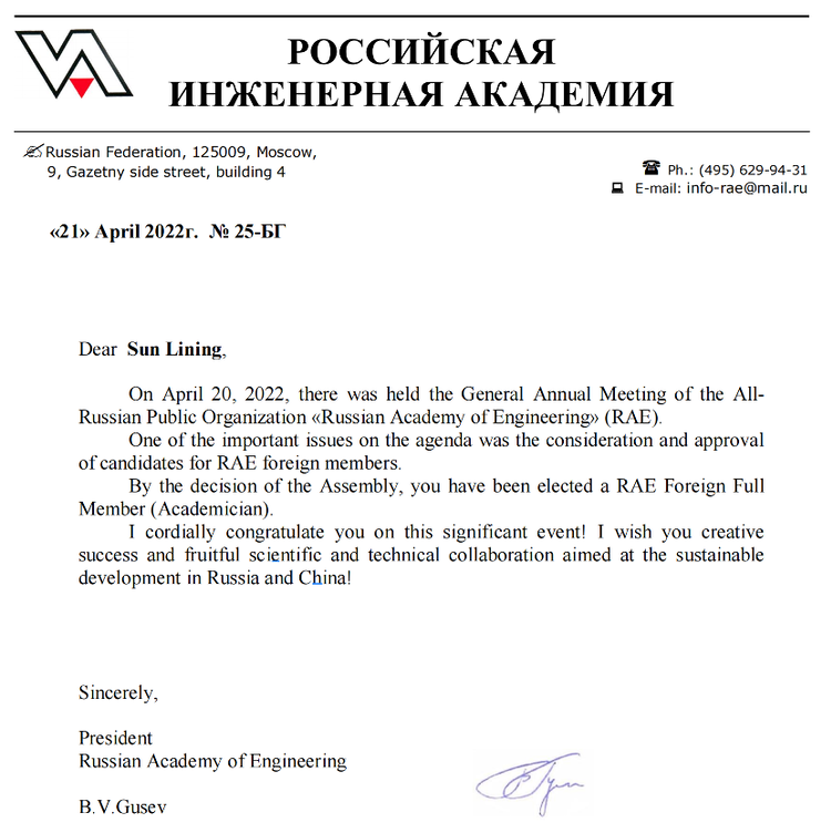 俄羅斯工程院(Russian Academy of Engineering,RAE)B.V.Gusev院長向蘇州大學(xué)孫立寧教授發(fā)來賀信,祝賀他成功當(dāng)選為俄羅斯工程院外籍院士。俄羅斯工程院高度評價他為推動全球機(jī)器人領(lǐng)域創(chuàng)新發(fā)展所做出的貢獻(xiàn),希望他未來在推動中俄兩國機(jī)器人相關(guān)領(lǐng)域科技創(chuàng)新與合作方面取得更多重要成果。