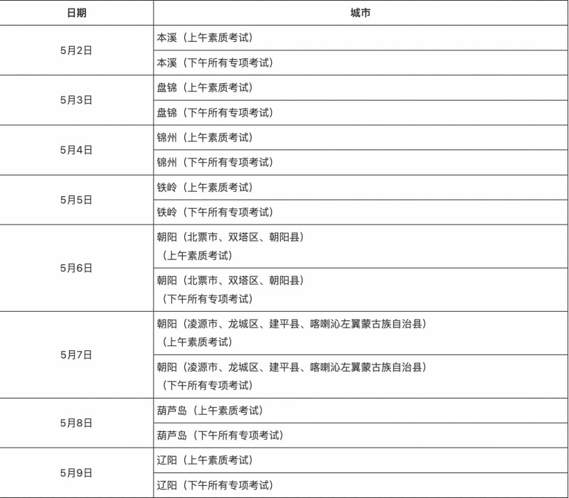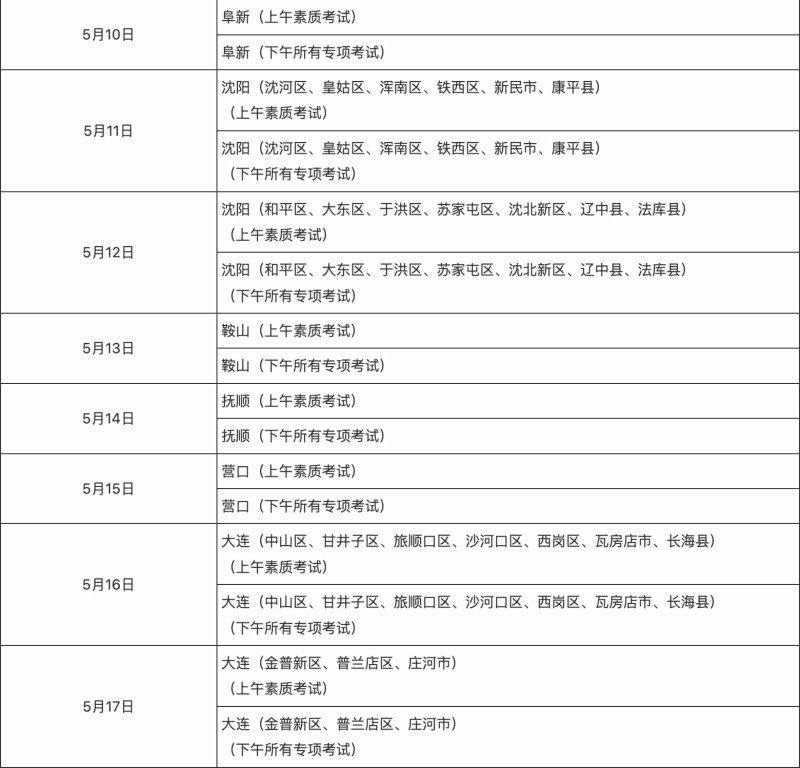 根據(jù)《遼寧省2022年普通高等學校招生體育專業(yè)考試新冠肺炎疫情防控工作預(yù)案》的要求,鑒于目前丹東市出現(xiàn)新冠肺炎疫情,現(xiàn)對我省2022年普通高校招生體育專業(yè)考試日程安排進行如下調(diào)整,望考生周知,并據(jù)此時間做好考前準備。