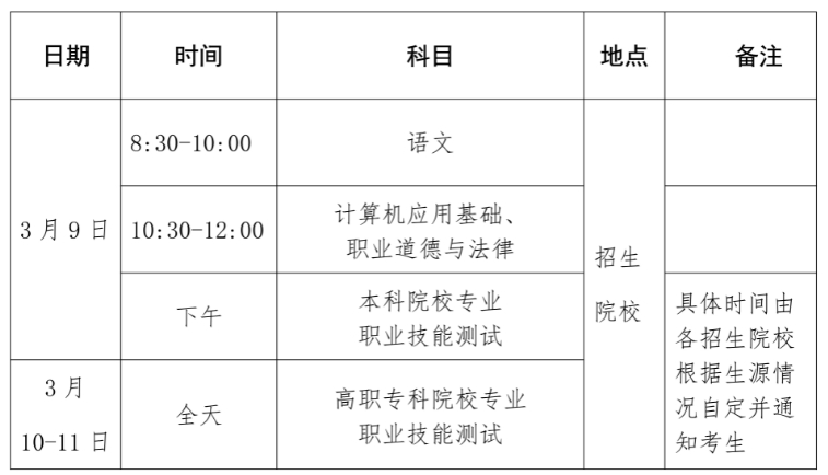 2024年3月22日前,各招生院校須將考生的職業(yè)技能測試成績上傳至報(bào)名系統(tǒng),4月12日前省考試局統(tǒng)一向考生公布成績。