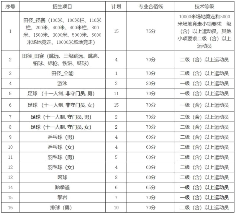 2.田徑_徑賽(5000米場(chǎng)地競(jìng)走和10000米場(chǎng)地競(jìng)走)、游泳、足球 (十一人制,非守門(mén)員,男)、足球 (十一人制,非守門(mén)員,女)、跆拳道、攀巖等項(xiàng)目要求具備一級(jí)(含)以上運(yùn)動(dòng)員技術(shù)等級(jí)稱(chēng)號(hào),其他招生項(xiàng)目要求具備二級(jí)(含)以上運(yùn)動(dòng)員技術(shù)等級(jí)稱(chēng)號(hào)??忌\(yùn)動(dòng)員技術(shù)等級(jí)以“國(guó)家體育總局運(yùn)動(dòng)員技術(shù)等級(jí)系統(tǒng)”公示的數(shù)據(jù)信息為準(zhǔn)。