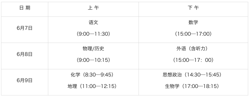 語文考試時長為150分鐘,數(shù)學和外語(含聽力)考試時長為120分鐘。各選考科目考試時長均為75分鐘,具體時間安排如下: