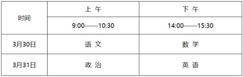文化考試  考生必須參加高考報名所在地省級招生考試機構組織的文化考試,使用國家通用語言文字作答?! ?、考試時間:3月30日、3月31日。  2、考試地點:具體見準考證  3、考試科目:語文、數(shù)學、政治、英語  4、考試分值:每科滿分150分,總分600分?! ◇w育專項考試  1、體育專項考試時間
