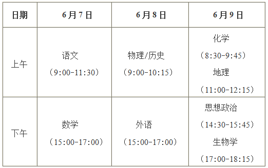 全國統(tǒng)考科目由教育部命題,按教育部規(guī)定時間組織考試。選擇性考試科目由我區(qū)自主命題,每門考試時長均為75分鐘,與全國統(tǒng)考科目的考試同期安排,如全國統(tǒng)考科目有調整,選擇性考試科目的考試安排相應調整。具體考試時間安排如下: