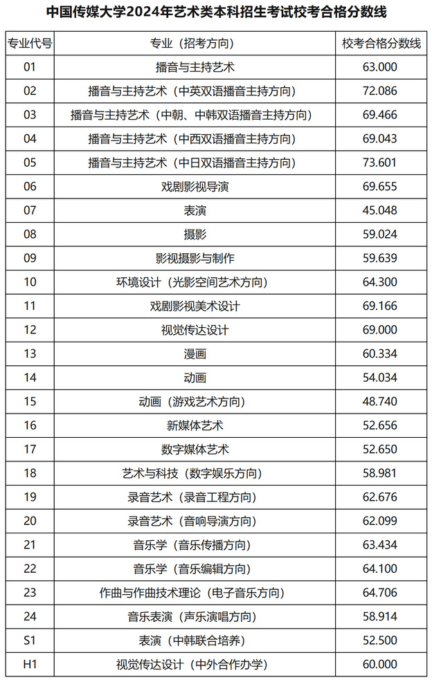 中國(guó)傳媒大學(xué)2024年藝術(shù)類(lèi)??己细穹?jǐn)?shù)線是多少分?