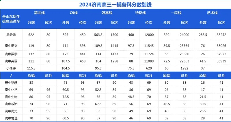山東濟南2024年高考一模各科劃線分數(shù)線是多少?