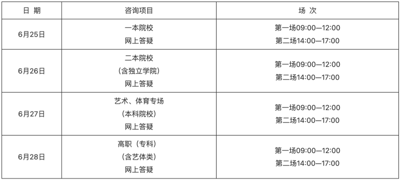 網(wǎng)上咨詢(xún)會(huì)共計(jì)4天,每天安排2場(chǎng)咨詢(xún),每場(chǎng)3個(gè)小時(shí)。具體安排如下: