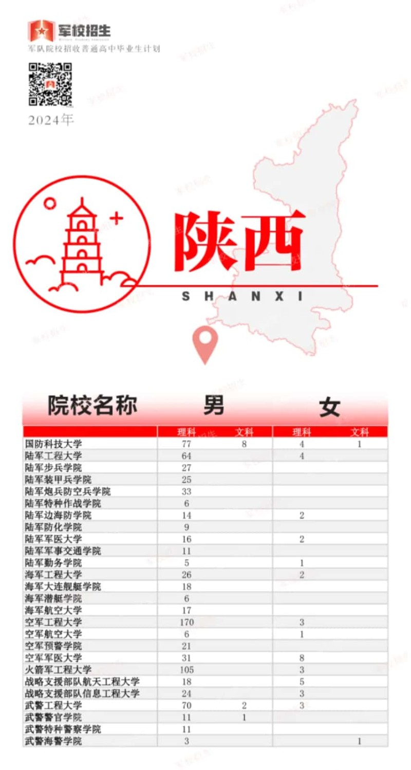 中央軍委訓(xùn)練管理部軍事教育局公布了2024年軍隊(duì)院校招生計(jì)劃,在陜西共招收人數(shù)如下: