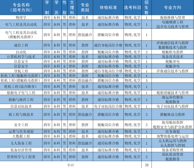海軍工程大學(xué)2024年面向高中畢業(yè)生招生計(jì)劃公布,面向陜西招生28人,招生專業(yè)有物理學(xué)、大數(shù)據(jù)工程、電氣工程及其自動(dòng)化等。