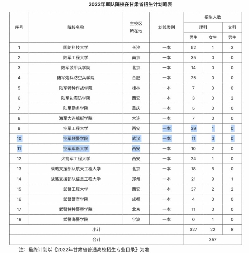 今年在我省招生的軍隊院校共18所,分別為國防科技大學、陸軍工程大學、陸軍裝甲兵學院、陸軍炮兵防空兵學院、陸軍特種作戰(zhàn)學院、陸軍邊海防學院、陸軍勤務學院、海軍大連艦艇學院、空軍工程大學、空軍預警學院、空軍軍醫(yī)大學、火箭軍工程大學、戰(zhàn)略支援部隊航天工程大學、戰(zhàn)略支援部隊信息工程大學、武警工程大學、武警警官學院、武警特種警察學院、武警海警學院。所有軍校招生劃線類型均為一本。今年共招收普通高中畢業(yè)生357名,其中理科男生327人、女生22人,文科男生8人。各院校及分校的簡介,考生可登錄學校招生網(wǎng)站或黃埔一號v軍校資訊”、“軍校招生”微信公眾號查詢。具體招生計劃參看附件。