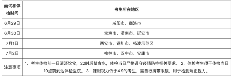 面試、體檢工作由省軍區(qū)戰(zhàn)備建設(shè)局會同有關(guān)軍隊院校和空軍軍醫(yī)大學(xué)所屬醫(yī)療機構(gòu)負(fù)責(zé)組織。今年面試、體檢工作繼續(xù)嚴(yán)格落實疫情防控相關(guān)要求,參加面試、體檢的考生須攜帶第二代居民身份證、準(zhǔn)考證、學(xué)籍所在高中出具的高中階段體質(zhì)測試及格證明、政治考核表、面試表(附件1,考生自行下載打印,填寫基本情況并粘貼1寸近期免冠彩照)和體檢前48小時內(nèi)核酸檢測陰性證明,按時參加面試、體檢。承檢醫(yī)療機構(gòu)為空軍軍醫(yī)大學(xué)所屬第九八六醫(yī)院(下稱第九八六醫(yī)院)北區(qū)(西安市碑林區(qū)友誼東路269號,原空軍第451醫(yī)院)。體檢時間為6月29日至7月4日,其中6月29日至7月2日為初檢階段,每日7∶00—14∶00組織(下午僅面向未完成項目的考生繼續(xù)檢查);7月3日,第九八六醫(yī)院將需復(fù)檢考生名單報空軍軍醫(yī)大學(xué)教務(wù)處審核,經(jīng)審核后向省軍區(qū)戰(zhàn)備建設(shè)局提供,于7月3日下午由相關(guān)軍分區(qū)通知復(fù)檢考生;7月4日上午按照相關(guān)規(guī)定組織集中復(fù)檢,復(fù)檢結(jié)論即為最終結(jié)論??忌M入體檢現(xiàn)場時須掃描“陜西健康碼”和“大數(shù)據(jù)行程碼”(下稱“雙碼”),并測量體溫,如當(dāng)日出現(xiàn)發(fā)熱(體溫≥37.3℃)、咳嗽、咽痛、乏力、呼吸困難等臨床癥狀與體征的,或“雙碼”不符合疫情防控要求的,一律暫不安排體檢,待排除新冠肺炎或“雙碼”正常后再視情體檢。
