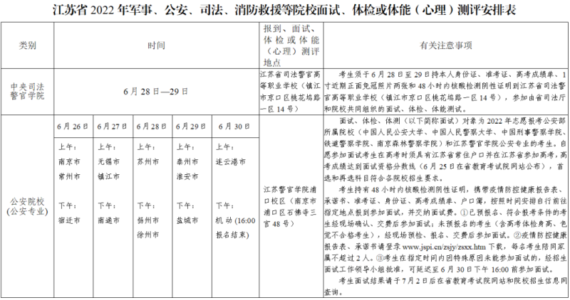 2.凡高考時具有江蘇省常住戶口并在我省參加普通高考,有志報考公安院校(公安專業(yè))且符合報考條件的考生,須于6月26日6:00至6月30日16:00,持48小時內(nèi)核酸檢測陰性證明,攜帶疫情防控健康報告表、承諾書以及本人高考準(zhǔn)考證、身份證、高考成績單、戶口簿等前往江蘇警官學(xué)院浦口校區(qū)(南京市浦口區(qū)石佛寺三宮48號),參加由省公安廳與公安院校共同組織的面試、體檢和體能測評。疫情防控健康報告表、承諾書可在江蘇警官學(xué)院招生信息網(wǎng)下載。請考生登錄省教育考試院網(wǎng)站或相關(guān)院校招生網(wǎng)站查詢具體安排。