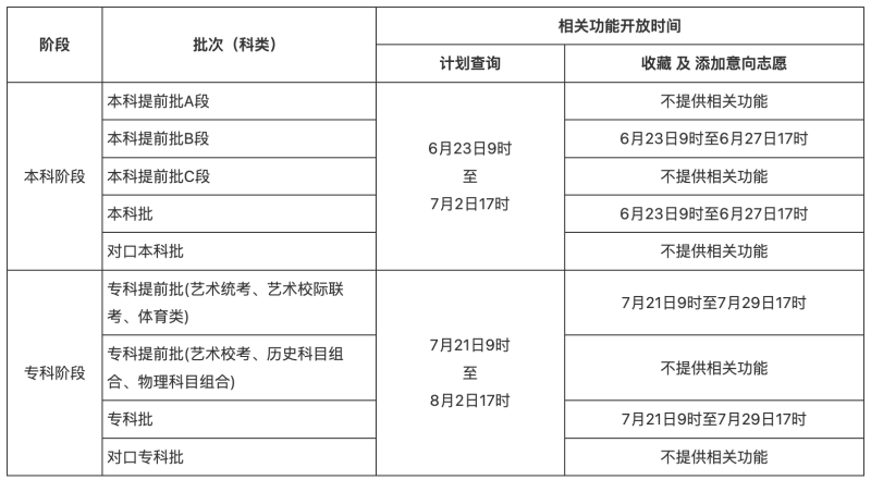 志愿填報(bào)輔助系統(tǒng)分本科階段和??齐A段兩個(gè)時(shí)間段進(jìn)行開(kāi)放,各階段包含批次及其相關(guān)功能開(kāi)放時(shí)間安排如下。