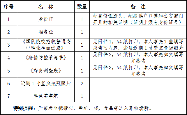 根據(jù)軍隊院校招收普通高中畢業(yè)生工作計劃,定于7月上旬組織面試和體格檢查(以下簡稱軍檢),現(xiàn)就有關事項明確如下: