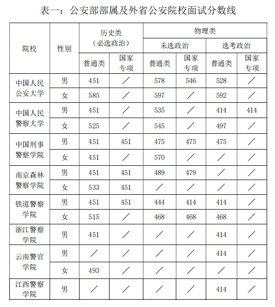 湖南省公安廳、湖南省教育考試院根據(jù)公安普通高等院校在湘招收公安專業(yè)學(xué)生的工作要求,劃定了各相關(guān)院校入圍面試分?jǐn)?shù)線,現(xiàn)公布如下: