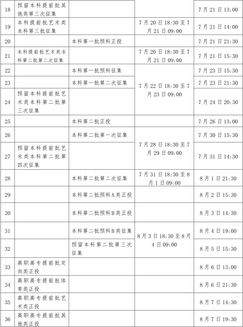 本表所列僅為錄取工作的計劃時間,由于錄取進程受多種因素影響,個別批次實際投檔錄取時間變化的可能性較大。如當(dāng)前批次的錄取進程延誤,將影響下一批次或后續(xù)多批次的投檔時間。