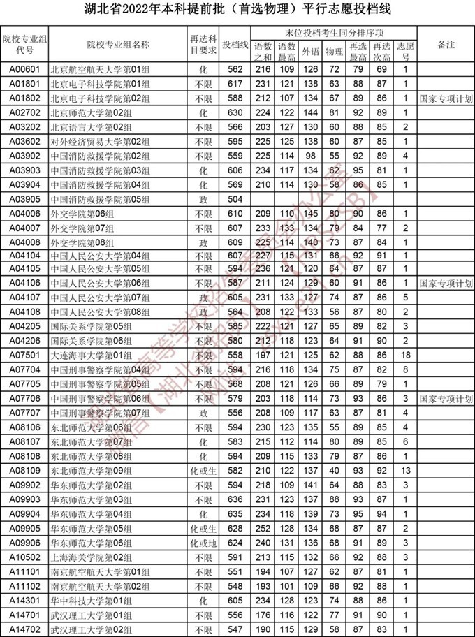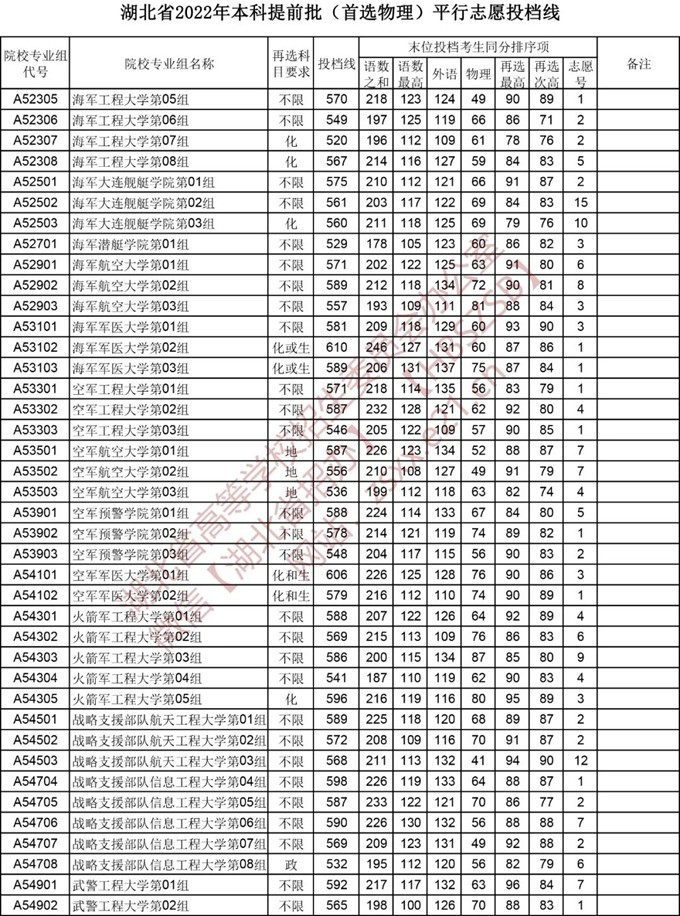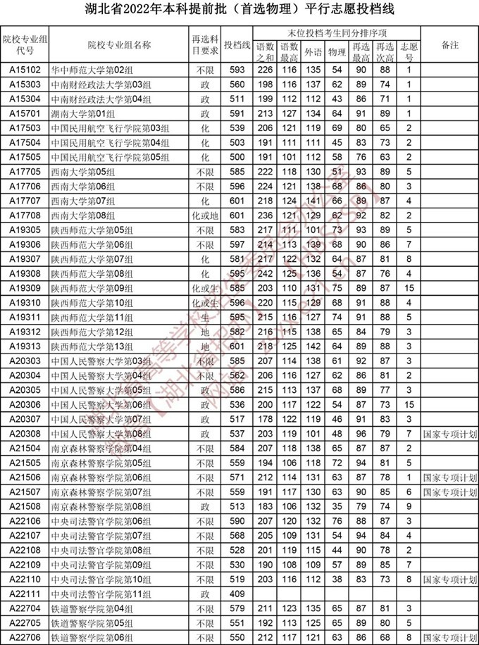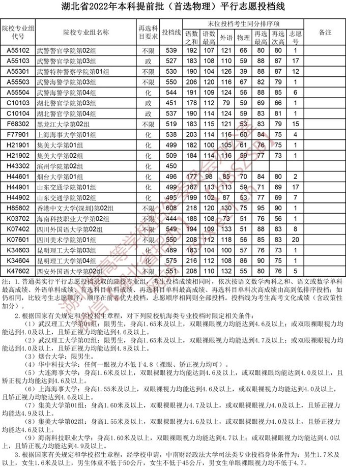 湖北省2022年本科提前批首選物理平行志愿投檔線公布