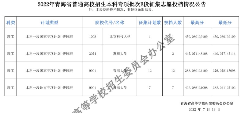 青海省2022年高考招生本科專項計劃E段征集志愿投檔情況公告