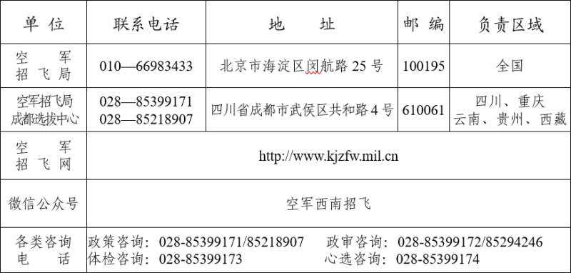 空軍招收飛行學(xué)員政策規(guī)定,由空軍招飛局負(fù)責(zé)解釋。未盡事宜,請(qǐng)來(lái)電來(lái)函或登錄空軍招飛網(wǎng)、關(guān)注“空軍西南招飛”微信公眾號(hào)查詢。